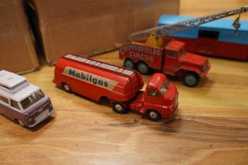A collection of forty Corgi Toys and fourteen Matchbox Series diecast vehicles, including; The Man From Uncle Oldsmobile, a James Bond Aston Martin DB5 in gold, a Commer 5-ton truck with trailer and a selection of loads, a police Austin mini van with dog and handler, five Chipperfield Circus vehicles, together with a selection of cars and other commercial vehicles, Matchbox Series vehicles include a Daimler ambulance, LT trolley bus, Morris Minor, etc.