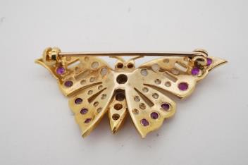 Lot 2911 , A ruby and split pearl butterfly brooch, set with half pearls and circular-cut rubies, mounted in 9ct gold, wingspan 4cm, British hallmarks, gross weight approximately 6 grams, pearls untested