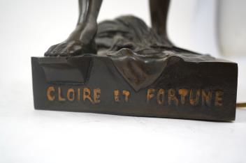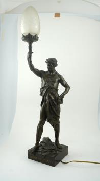 After Émile Louis Picault, a large bronze figural lamp, modelled as a man wearing a loincloth holding aloft a lamp, the base modelled with a hammer and compasses, inscribed Gloire et Fortune, signed, 85cm high