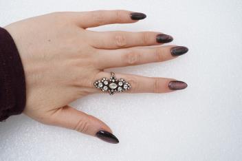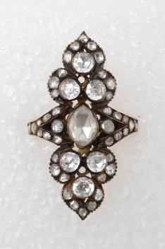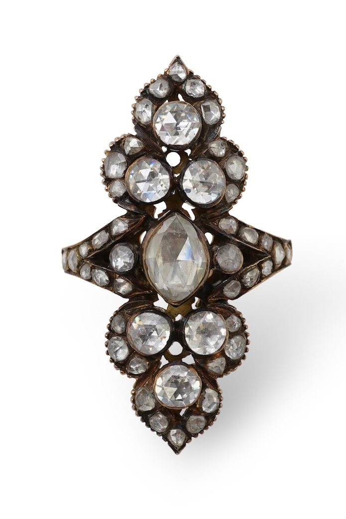 A diamond ring, of navette-shaped outline with foliate borders, set with rose-cut diamonds in closed settings, mounted in silver and gold, size K, gross weight approximately 8.4 grams