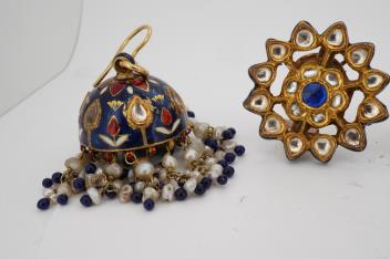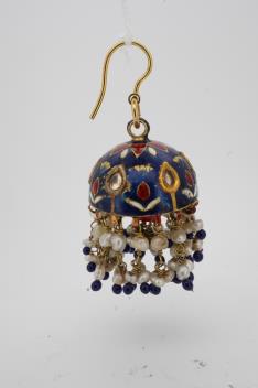 Lot 2990 , Two pairs of Indian enamelled earrings, comprising: one of chandelier design, set with rock crystals and applied with blue, white and red enamel, suspending a fringe of cultured pearls and blue and red pastes, length 5.1