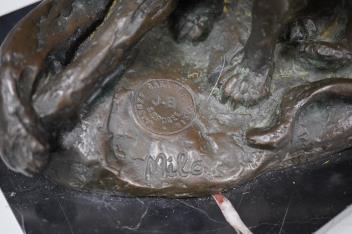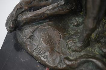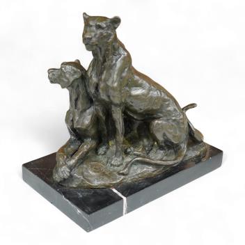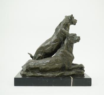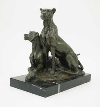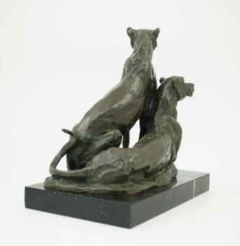 Miguel Fernando Lopez (Portuguese, contemporary): A painted bronze group of two lionesses, signed "Milo" to the naturalistic base, "Bronze Garanti Paris J.B. Deposee" foundry stamp, raised on a rectangular black marble base, 28cm high overall
