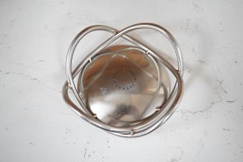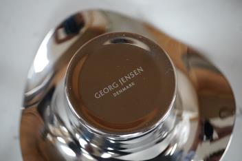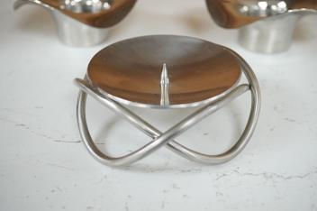 A pair of Georg Jensen stainless steel Cobra candleholders and a Georg Jensen Glow candle, latter 10cm diameter.