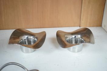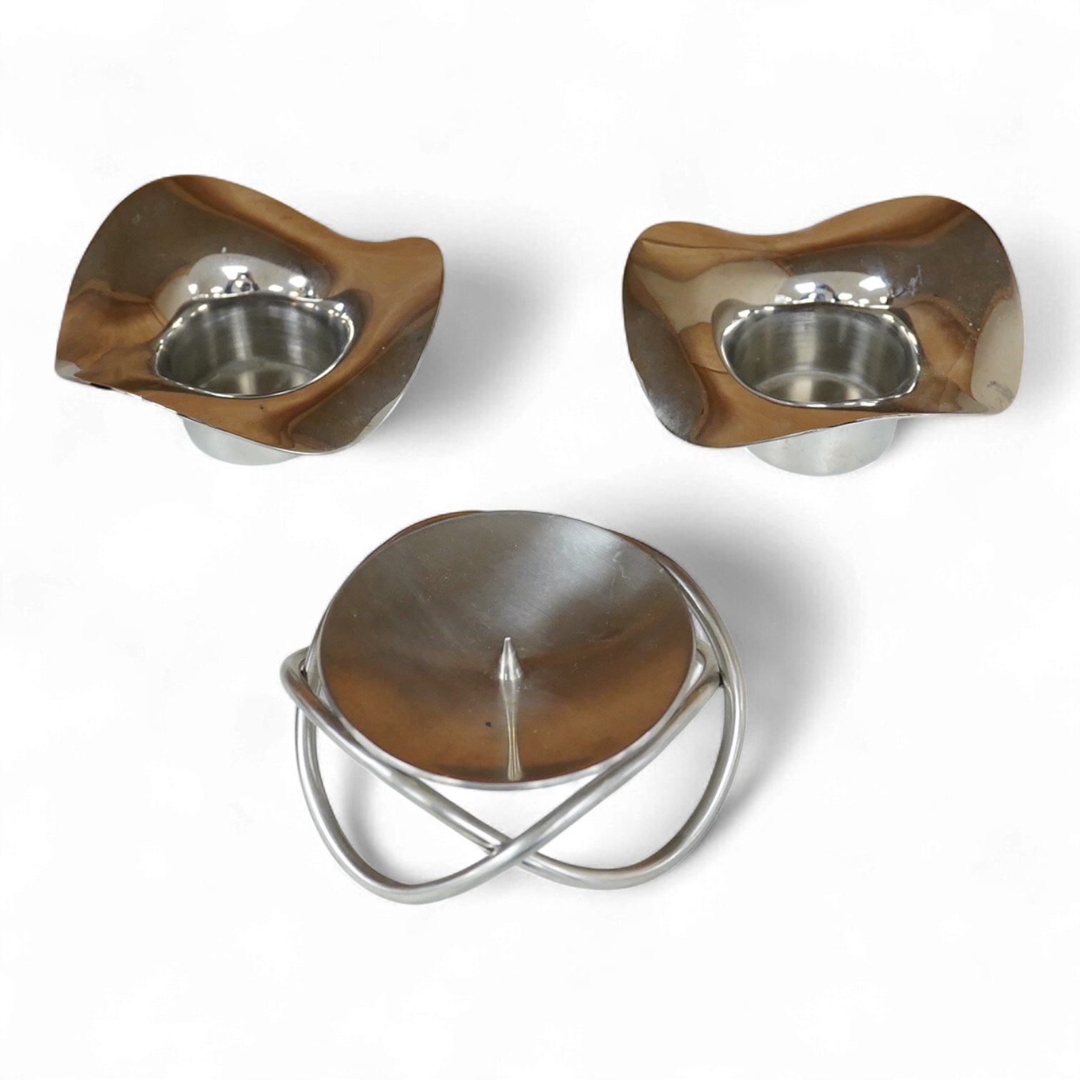 Lot 1300 , A pair of Georg Jensen stainless steel Cobra candleholders and a Georg Jensen Glow candle, latter 10cm diameter.
