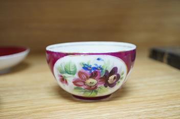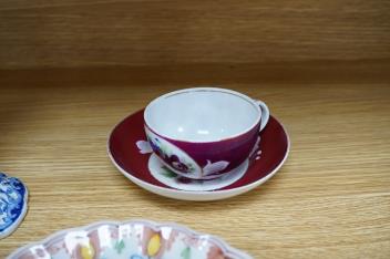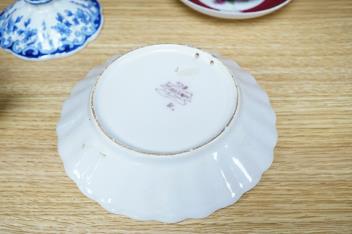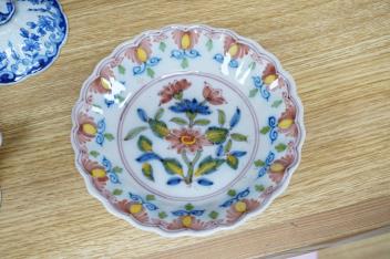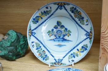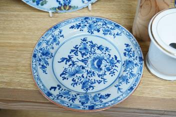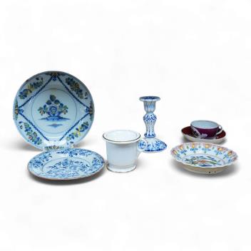 Lot 2366 , An 18th century Delft plate, two tin-glazed dishes and candlestick, a Gardener Russian porcelain tea cup and saucer, and a mug with liner, largest 22cm in diameter