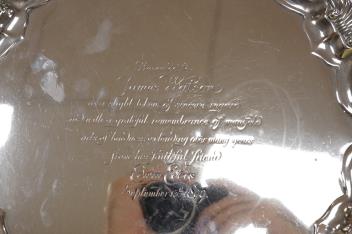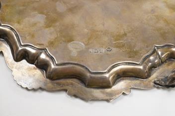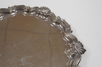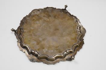 Lot 2845 , A late Victorian silver salver, with shell and scroll border and engraved inscription, on three claw and ball feet, Mappin Brothers, Sheffield, 1896, 26.4cm, 15.2oz.