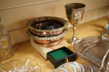 Lot 2434 , A Victorian gilt and enamelled green glass decanter, a similar vase, a small square decanter, Venetian dishes, silver plated coasters, etc