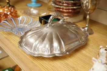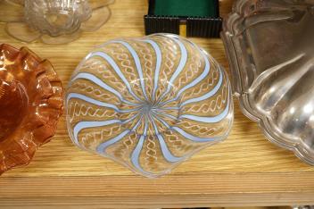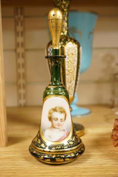 A Victorian gilt and enamelled green glass decanter, a similar vase, a small square decanter, Venetian dishes, silver plated coasters, etc