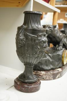 A clock garniture signed Boffil, ‘Lionne aux Agnets’, a bronze figure of a lioness mounted on a purple veined marble base with applied brass plaque, enamel dial, containing a two train French movement striking on a bell, stamped 1028, together with an associated pair of bronze urns decorated with lions heads and foliage swags, mounted on similar coloured marble bases, the clock; 33cm high, 52cm wide, the urns; 37cm high