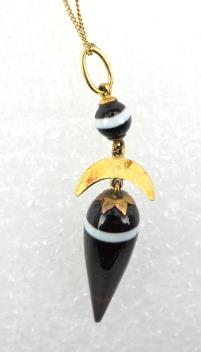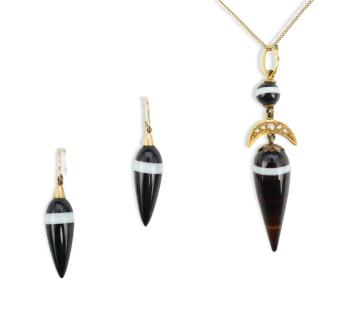 An onyx demi-parure, early 20th century and later, comprising: a pendant, set with a banded onyx bead suspending a crescent moon motif set with seed pearls and a pointed onyx drop, to a later gold chain, pendant length 5.4cm, chain length 40cm, stamped 750; and a pair of similar onyx drop earrings, hook fittings, length 3.4cm each