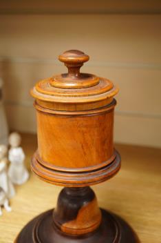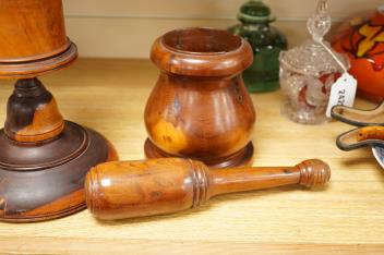 A 19th century treen lignum vitae pestle and mortar and turned cup and cover on stand- 25cm high