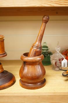 Lot 2427 , A 19th century treen lignum vitae pestle and mortar and turned cup and cover on stand- 25cm high