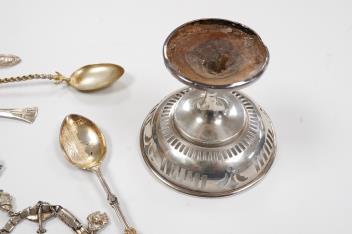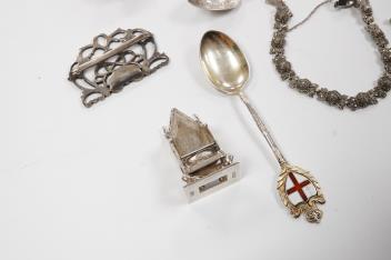 A small group of silver including an Edwardian miniature model of a throne by Edward Foligne Braham, Birmingham, 1901, 50mm, a small comport, one part of a belt buckle and three commemorative spoons, together with a gilt white metal spoon with throne terminal, a plated teaspoons, a silver and marcasite set bracelet and a white metal bracelet.