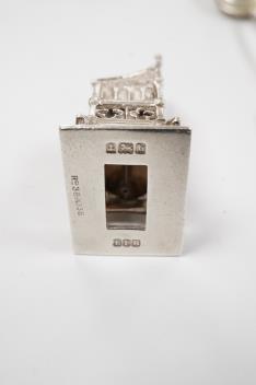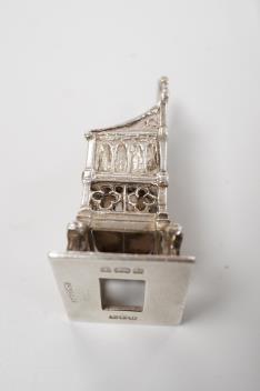 Lot 1825 , A small group of silver including an Edwardian miniature model of a throne by Edward Foligne Braham, Birmingham, 1901, 50mm, a small comport, one part of a belt buckle and three commemorative spoons, together with a gilt