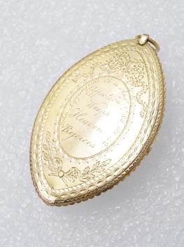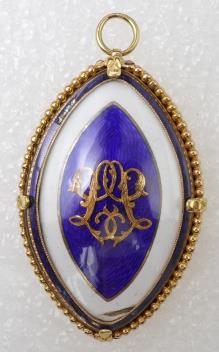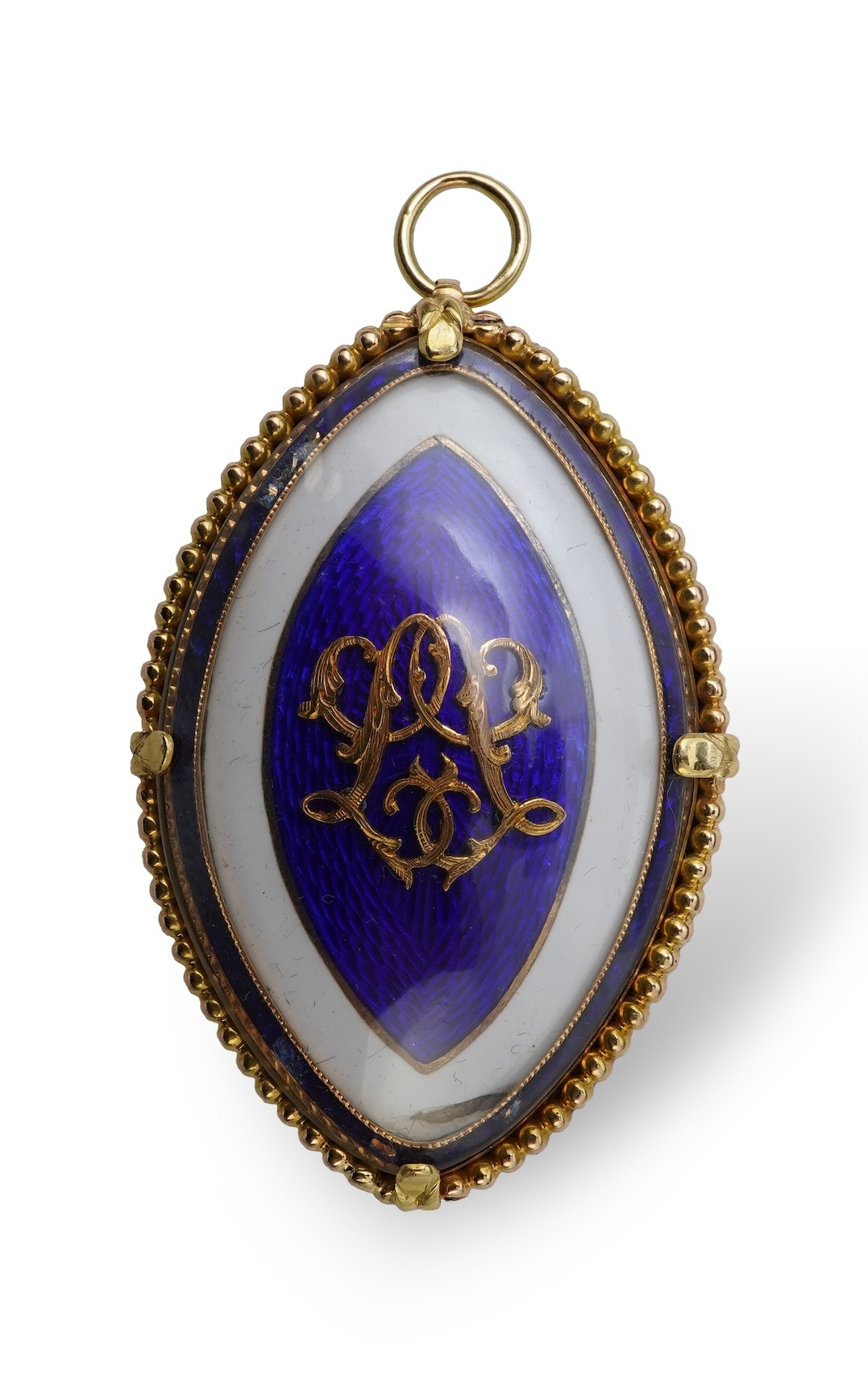A George III gold and enamel mourning pendant, circa 1786, of navette-shaped outline, the central glazed compartment with a monogram of confronted 'L' in cut gold, to a ground of blue guilloché and white enamel, within a beaded border, the reverse engraved with an oval wreath containing the inscription 'John Leppingwell Ob 4th Aug 1786 aet 42' and 'Affection Weeps Heaven Rejoices', surrounded by engraved ribbon bows and laurel sprays, length 5.6cm, gross weight approximately 20.4 grams