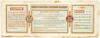 An original early 20th century SECR ‘carriage print’ advertising poster divided into three sections under the title South Eastern & Chatham Railway, including a buffet menu, a notice regarding spitting and a caution note regarding carriage doors, poster dimensions 25 x 67cm, now housed in a later frame
