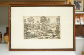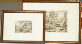 Lot 1698 , After Jonas Umbach the elder (German, 1624–1693), ‘Italian Landscape with Ruins’, etching and after Adriaen van der Cabel (Dutch, 1631-1705), Landscape with woman Walking Along the River’, etching, largest 15 x 23cm