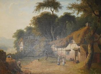 Lot 1707 , William Allport (1779-1831), Pastoral landscape with figures beside a half timbered cottage, titled 'North Wales', label verso, oil on canvas, 28 x 38cm, gilt frame