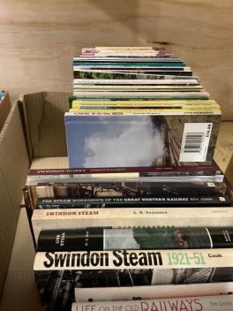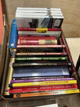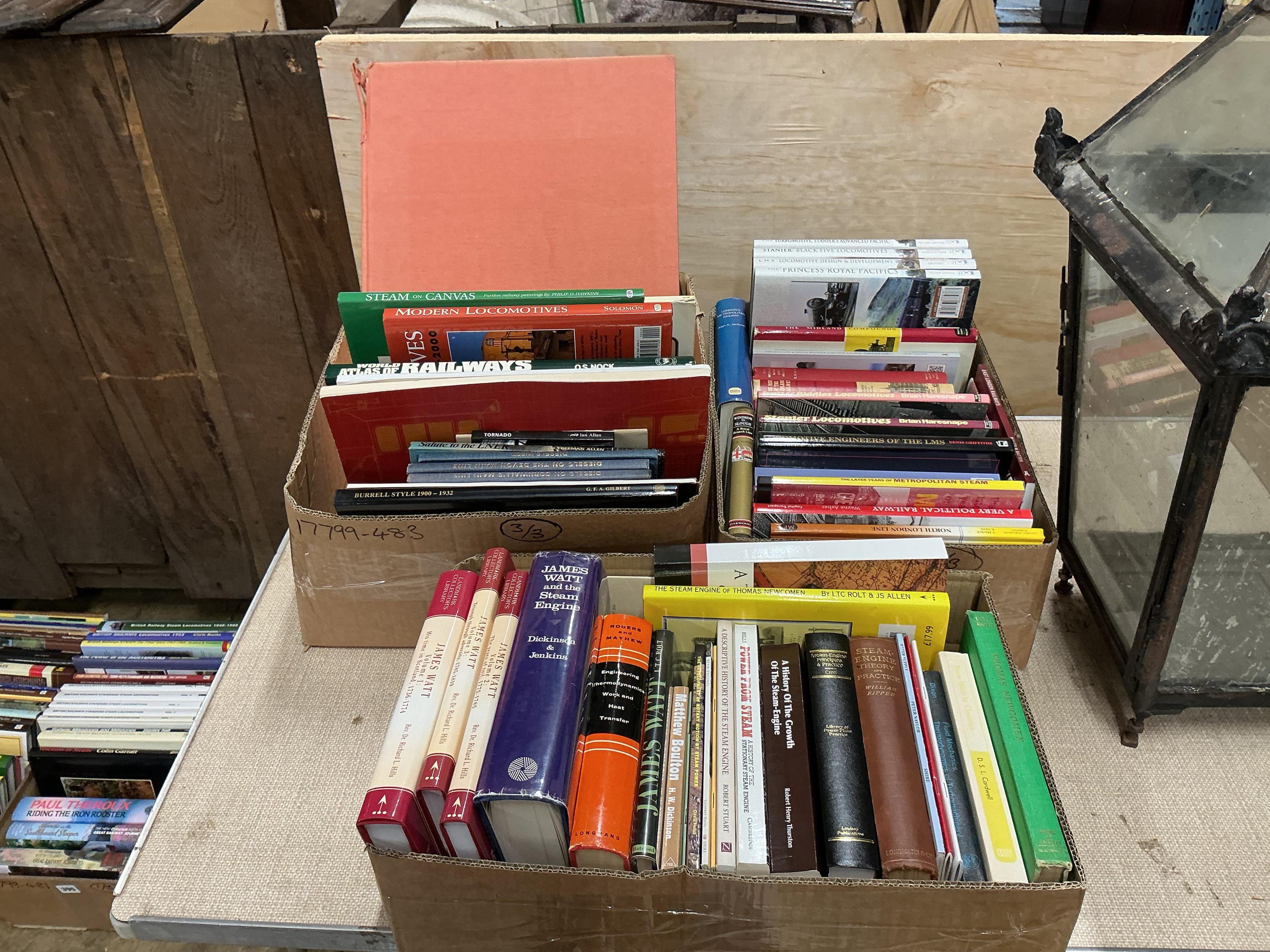 Three boxes of railway related books, subjects include; James Watt, Steam Engine Theory, LMS Locomotive Design & Development, Locomotive Engineers of the LMS, Fowler Locomotives, World Atlas of Railways, Steam on Canvas, Bourne’s London & Birmingham Railway, etc., publishers include; Pen & Sword, Landmark Publishing, OPC, David & Charles, etc.