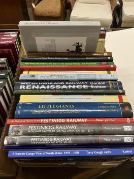 Lot 401 , Two boxes of railway related books, subjects include; the Festiniog Railway, the Welsh Highland Railway, The Vale of Rheidol Light Railway, the Royal Arsenal Railways, the North Cornwall Railway, the North Devon Line, th
