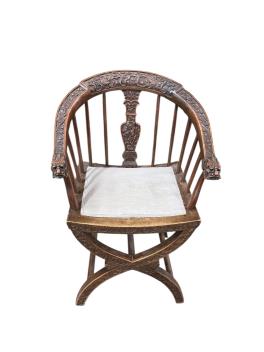 An Italian carved walnut 'X' frame elbow chair, width 58cm, depth 43cm, height 88cm