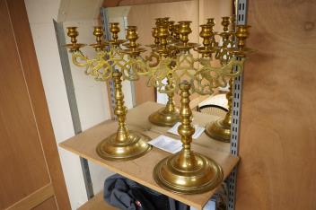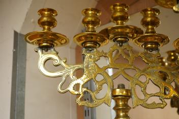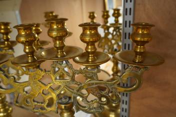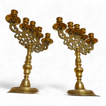 Lot 1468 , A pair of Juddah Sabbath five light brass candlesticks, 50cm high