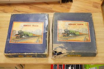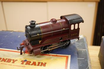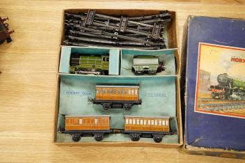 Lot 287 , Two Hornby 0 gauge tinplate clockwork train sets; a No.601 LMS Goods Set with 0-4-0 tender locomotive, 5600, in maroon livery, etc., together with a No.501 LNER passenger set with 0-4-0 tender locomotive, 1842, in green