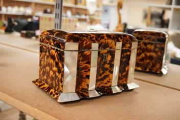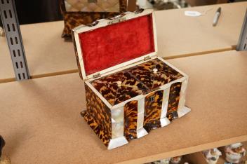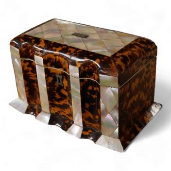 Lot 1379 , A mid 19th century decorative tortoiseshell and mother of pearl tea caddy, 20cm wide x 12.5cm high CITES Submission reference CXXC25Q1