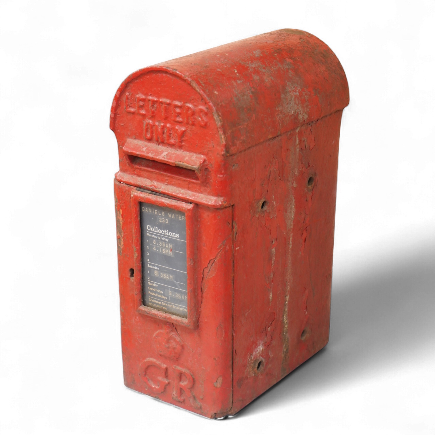A George V red painted iron domed topped wall/post mounting post box, height 50.cm high x 19cm wide
