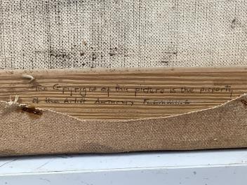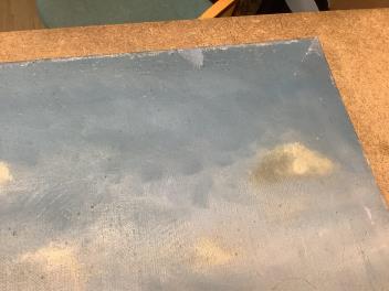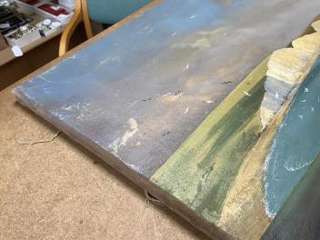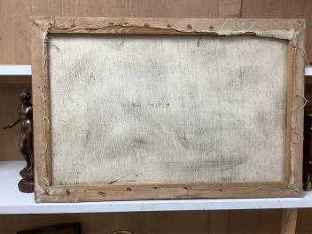 Canvas with diagonal tear and unsightly losses to oil paints in this torn area, all shown in image 5; several rubs to oils upper left, image 6; further flake to oil paint top-right, and coloured-in to disguise; flaked paint beneath signature, image 4. Reverse images show two inscriptions, images 8 to 10. Rusting staples, image 11.