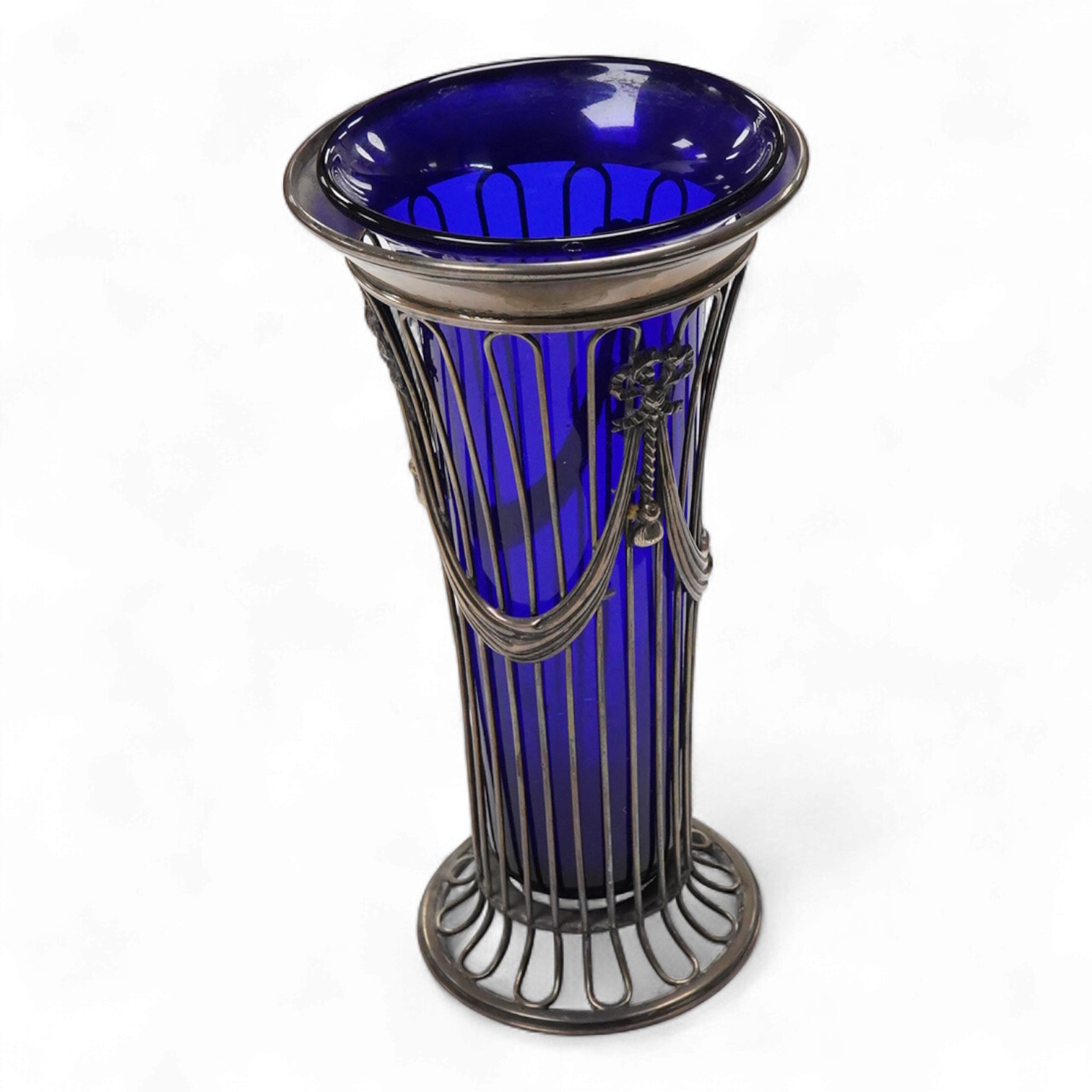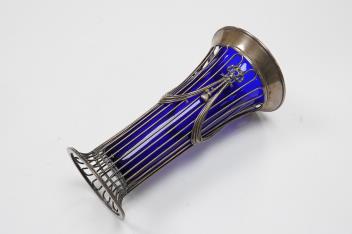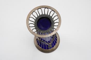 Lot 839 , A George V pierced silver trumpet shaped flower vase, with blue glass liner, indistinct maker's mark, London, 1911, 19.7cm.