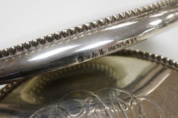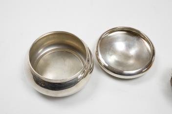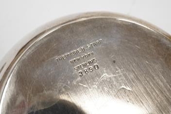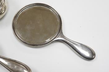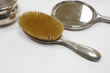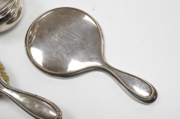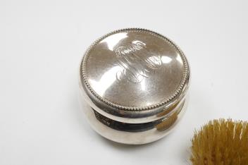 Lot 838 , A North American sterling dressing table pot, height 68mm, mirror and brush, the pot inscribed Theodore B. Starr, all engraved with the letter 'C'.