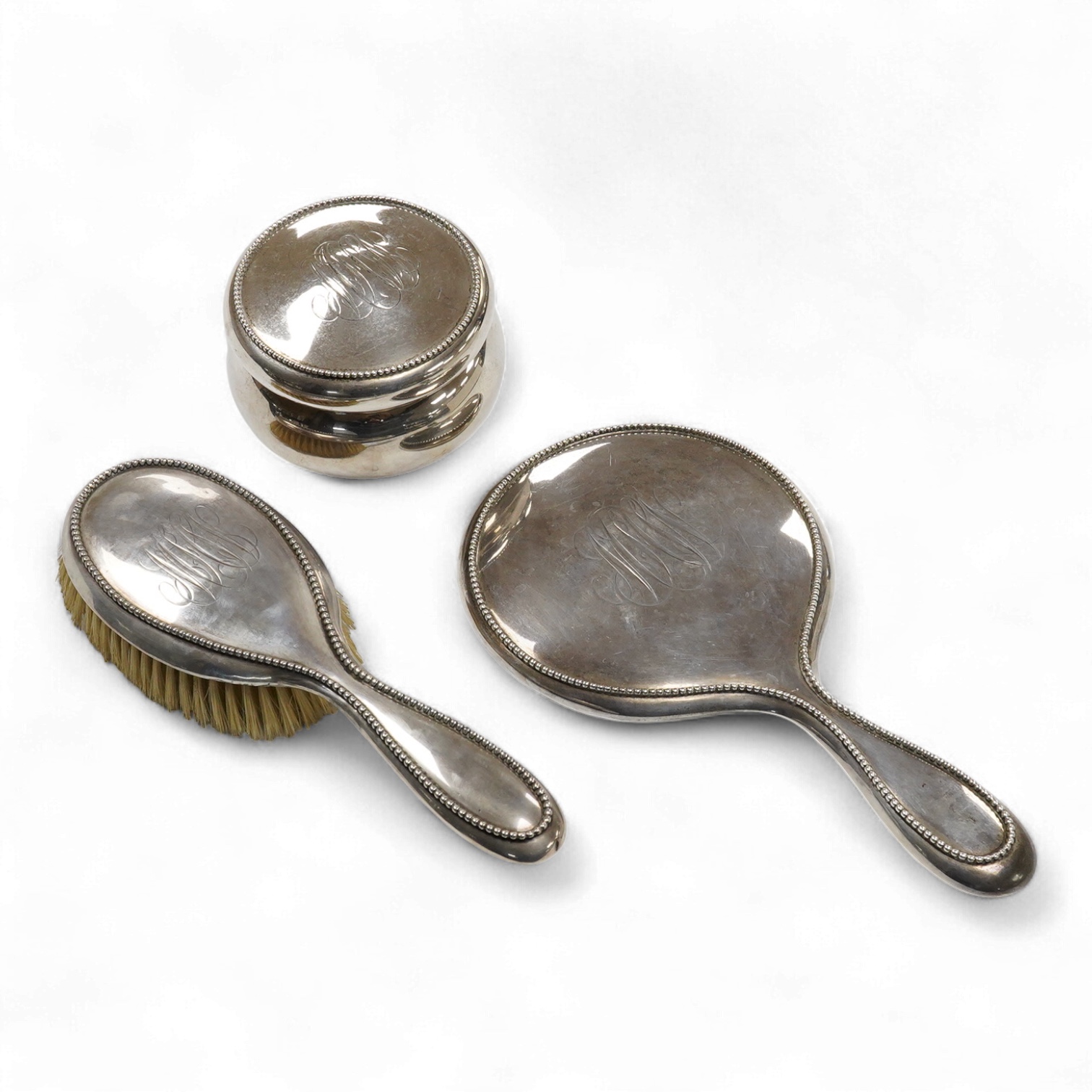 A North American sterling dressing table pot, height 68mm, mirror and brush, the pot inscribed Theodore B. Starr, all engraved with the letter 'C'.