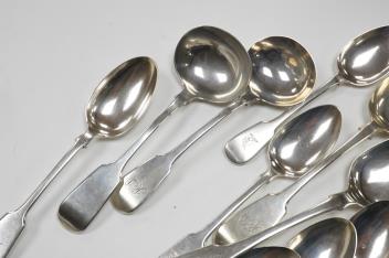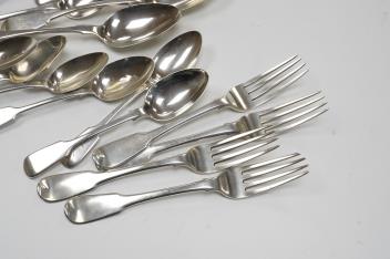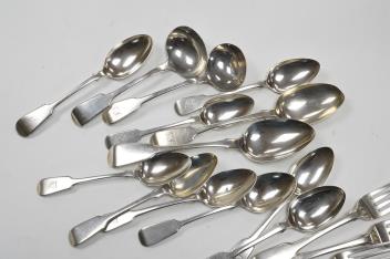 Lot 846 , A matched part canteen of 19th century silver fiddle pattern flatware, various dates and makers, including a set of four George III table forks, Eley & Fearn, London, 1807, 28oz, and one plated table spoon.