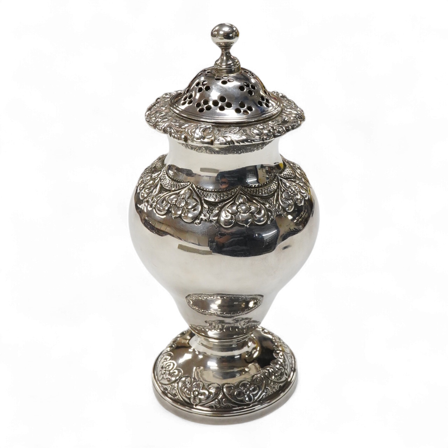 A George IV silver pounce pot, by Joseph Angell I, with foliate decoration, London, 1823, height 12.7cm, 4.2oz.