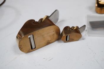 Lot 1032 , A graduated group of four Ibex bronze violin maker’s planes, approx width of irons; 23mm flat (with alternative additional scrub iron), 18mm curved, 13mm curved, and 10mm curved