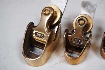 A graduated group of four Ibex bronze violin maker’s planes, approx width of irons; 23mm flat (with alternative additional scrub iron), 18mm curved, 13mm curved, and 10mm curved