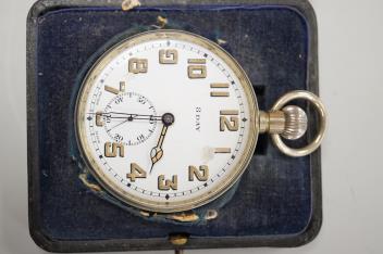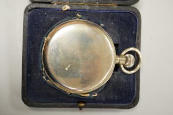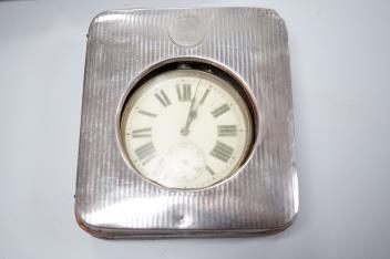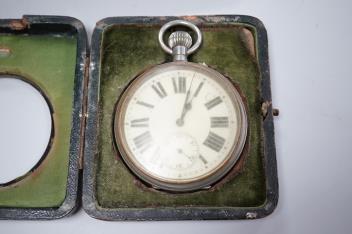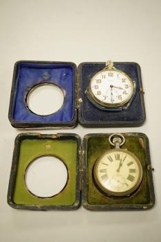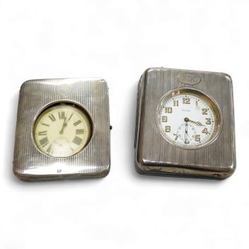 Lot 1840 , Two George V silver mounted travelling watch cases, both Birmingham, 1921, both containing chrome cased pocket watches. largest case 11.4cm.