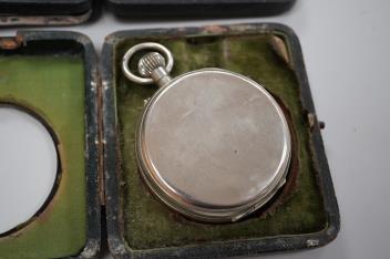 Two George V silver mounted travelling watch cases, both Birmingham, 1921, both containing chrome cased pocket watches. largest case 11.4cm.