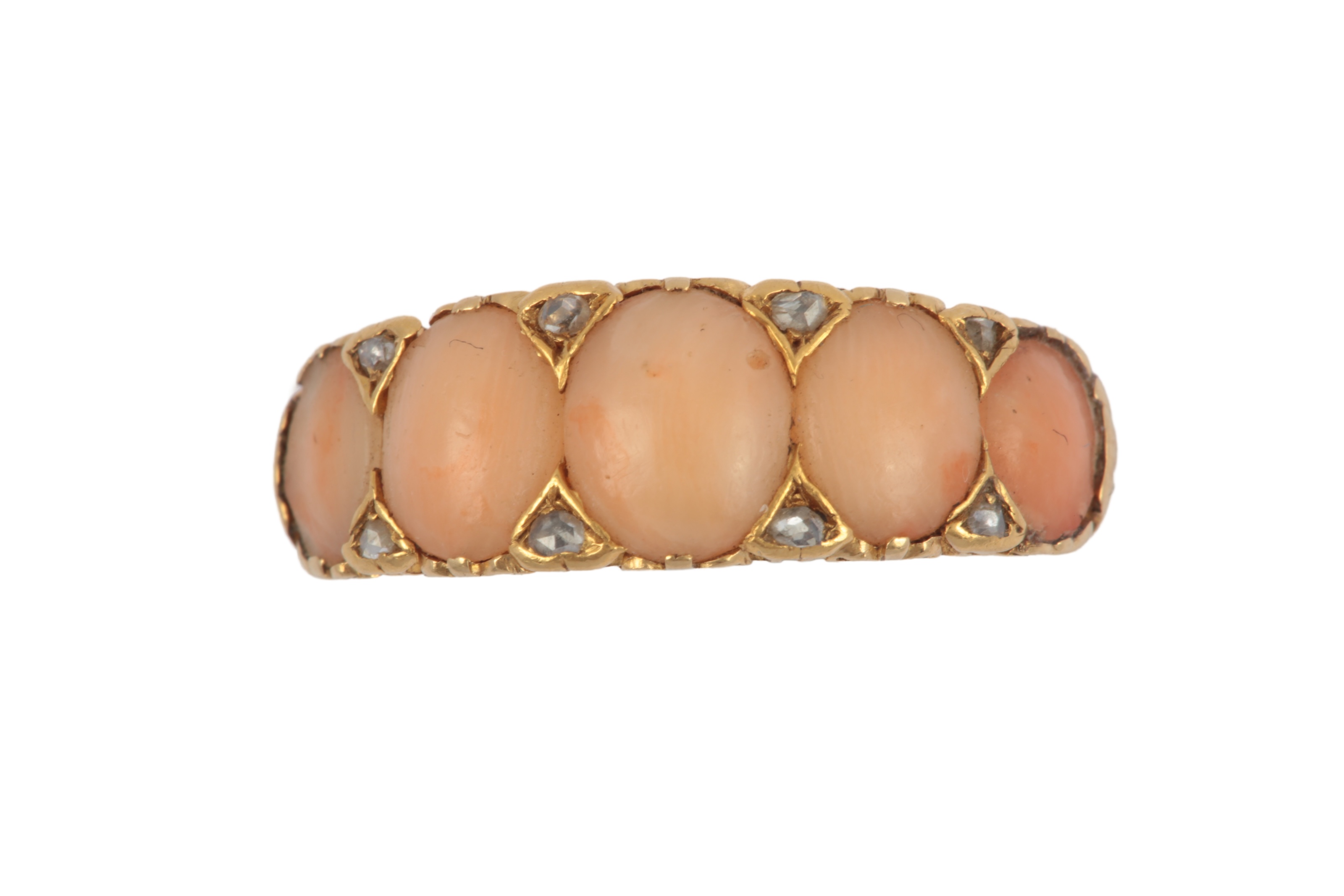A coral and diamond ring, late 19th century, set with a graduated sequence of pale coral cabochons, spaced by rose-cut diamonds to a gold mount with a scrolled gallery, size M1/2, faint marks, gross weight approximately 4.5 grams
