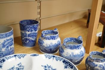 Lot 455 , An 18th century Delft jug, another tin glazed dish, a Worcester Hanbury dish and five pieces of Copeland Spode Italian blue and white, tallest 22.5cm