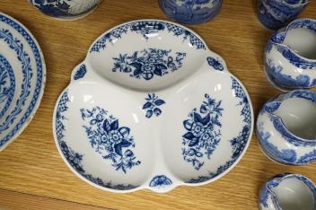 An 18th century Delft jug, another tin glazed dish, a Worcester Hanbury dish and five pieces of Copeland Spode Italian blue and white, tallest 22.5cm
