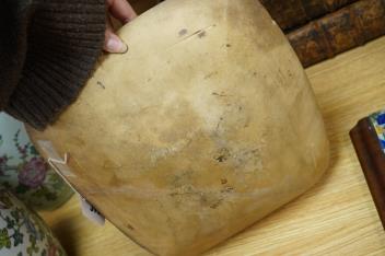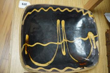 Lot 373 , A 19th century pottery slipware baking dish (restored), 34cm wide and a Spanish maiolica tile