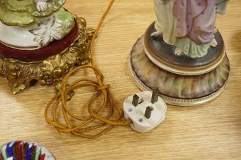 A Continental Three Graces table lamp and another table lamp mounted with a seated figure, largest 44cm high including the fitting