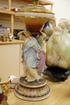 Lot 447 , A Continental Three Graces table lamp and another table lamp mounted with a seated figure, largest 44cm high including the fitting