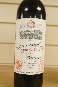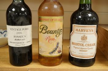 A bottle of Fonseca 1970 vintage port, a bottle of 1970 Chateau Grand-Puy-Lacoste, a litre bottle of Bounty rum and a litre bottle of Harvey’s Bristol Cream