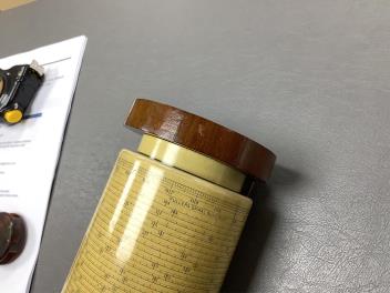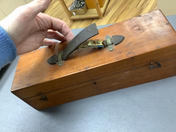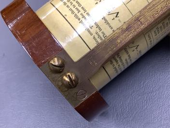 Turned mahogany handle complete and screws into place tightly; wood finish bright but with acceptable light scratches not too detrimental; serial number 1580 over 1902, impressed on longer cursor; not personalised by a former user; two small dents to revolving outer scale, image 9. Box generally good although handle worn and torn; no key.