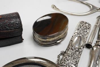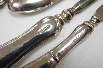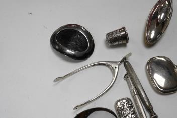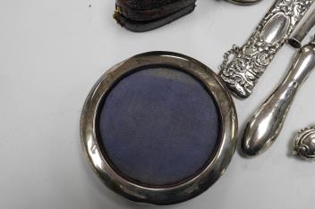 Lot 834 , A collection of assorted small silver including a pair of George V wishbone sugar nips, six handled nail implements, an Edwardian mounted circular photograph frame, spoon brooch, two thimbles and a propelling cigar pierc