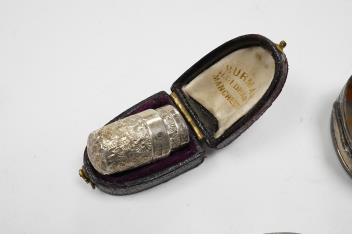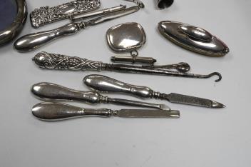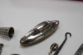 A collection of assorted small silver including a pair of George V wishbone sugar nips, six handled nail implements, an Edwardian mounted circular photograph frame, spoon brooch, two thimbles and a propelling cigar piercer, together with six other white metal or 925 items including a needle case.
