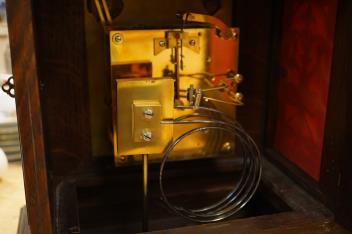 Lot 487 , A mahogany 19th century German two train mantel clock, striking on two coiled gongs, 41cm high.